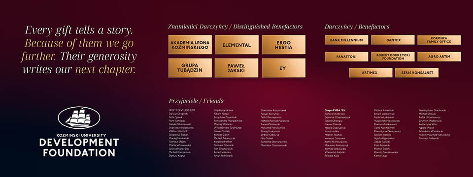During the inauguration of the 2025/2026 academic year at Kozminski University, we proudly unveiled the Donor Wall – a special place created on the initiative of the Kozminski University Development Foundation to honor those whose trust, philanthropy, and commitment support the development of education, talent, and the idea of the Endowment Fund – the foundation of sustainable growth and academic independence.